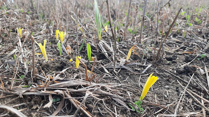 A szeptember végi esők hatására a Körös-Maros Nemzeti Parkhoz tartozó kardoskúti Fehér-tó közelében és a Csorvási löszgyepen is előbújtak az apró vetővirágok sárga virágai.
