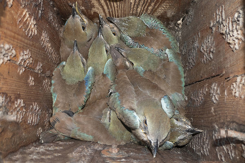 Cserebökényben két odúban is kilenc fiókát nevelnek a szalakóták July 5.