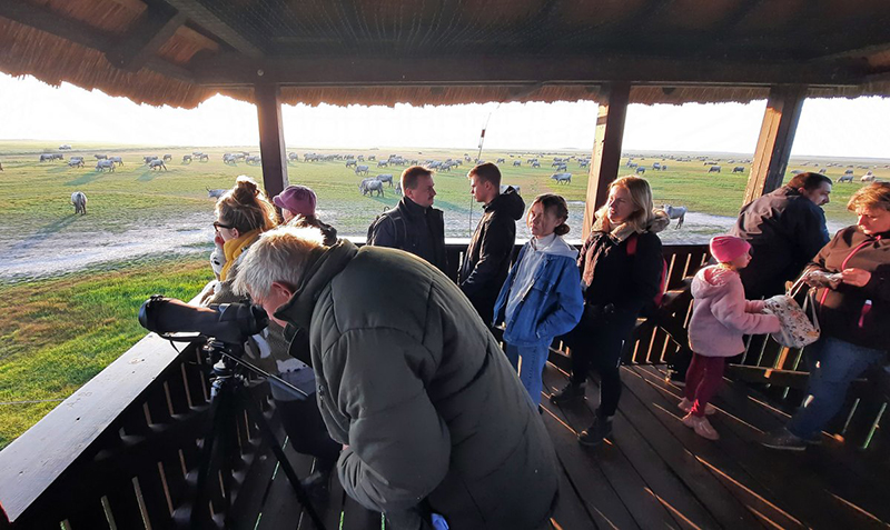A program keretében kollégáink először rövid előadást tartottak a táj történetéről, a madárvonulásról, és a darvakról. A program idejére a kilátó közelébe hajtottuk az állattartótelepen tartott magyar szürke szarvasmarhákat, cigája és rackajuhokat, így vendégeink egészen közelről láthatták ezeket az őshonos háziállatokat. Az est fénypontja természetesen a darvak alkonyatkor kezdődő behúzása volt, amikor a környező gyepeken gyülekező egyedek több százas csapatokban, hangos krúgatással szálltak be a tóra éjszakázni. Itt, a sekély vízben zavartalanul, biztonságban tölthetik az éjszakát. Reggel aztán ismét felszállnak, s a tó 20-30 km-es körzetében keresnek maguknak táplálkozóhelyeket. A nappali órákban kisebb-nagyobb csapatokban láthatjuk őket a szántóföldeken.