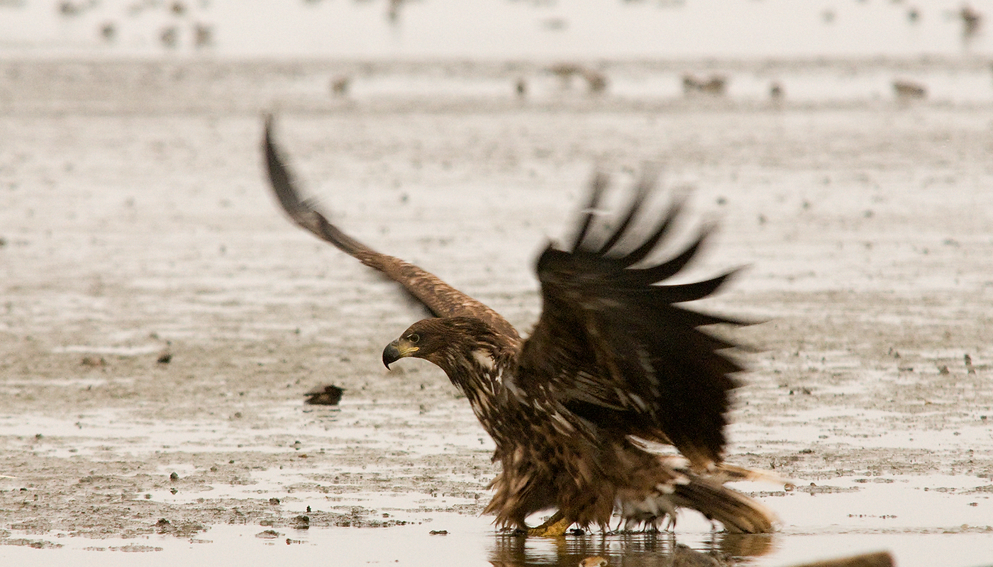 A kép egy lehalászás alatt lévő halastavon készült. A sas meglepő módon a reggelit követő tisztálkodás végén csücsült bele a pocsolyába.