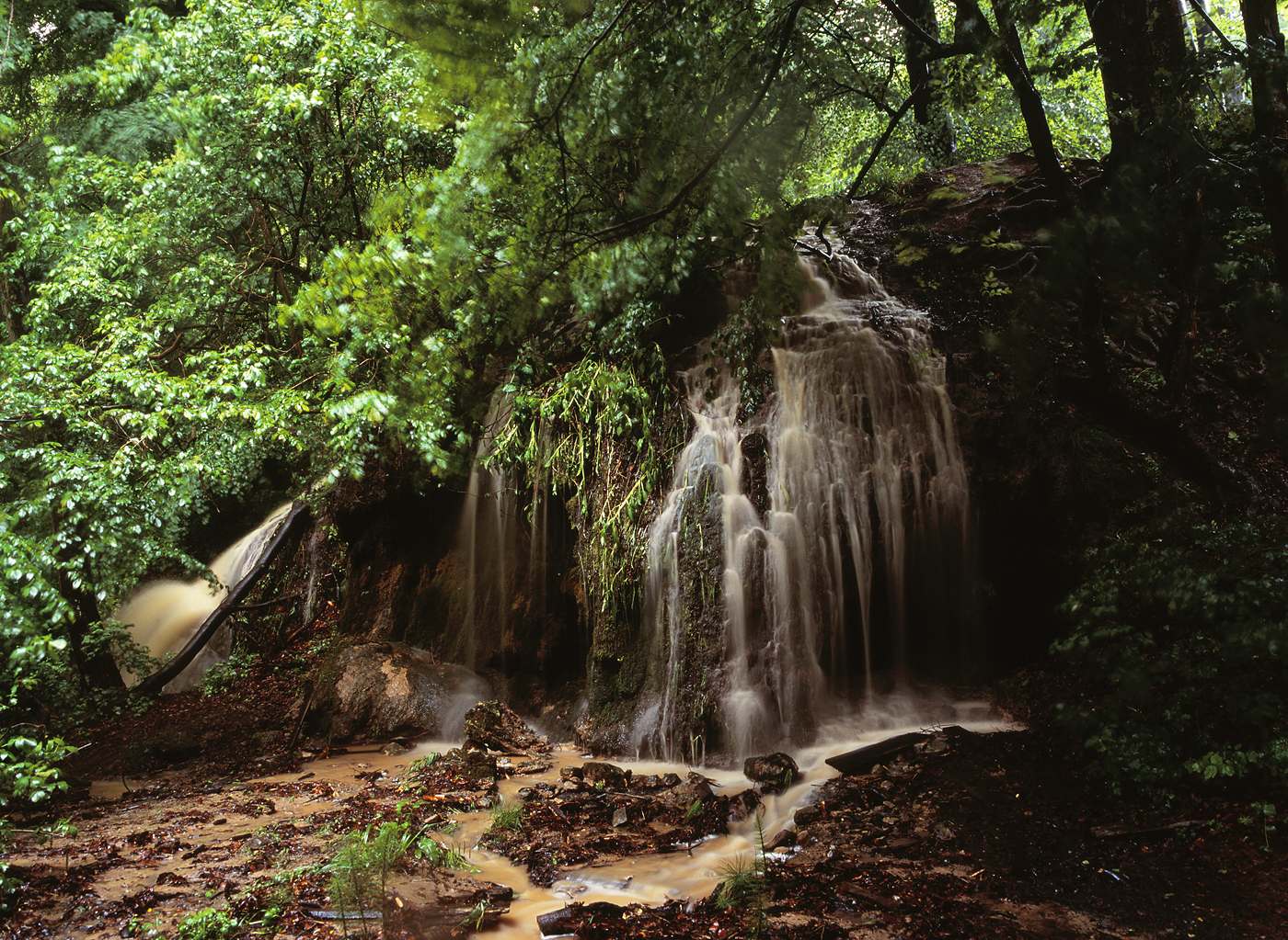 Kelet-Mecsek, Csurgó A nagy májusi esõ sosem látott víztömeget zúdított le a Mecsek erdeire. A kép a felhõszakadás közben, neylon zsákkal védett géppel készült. Pentax 645NII, Fuji Velvia