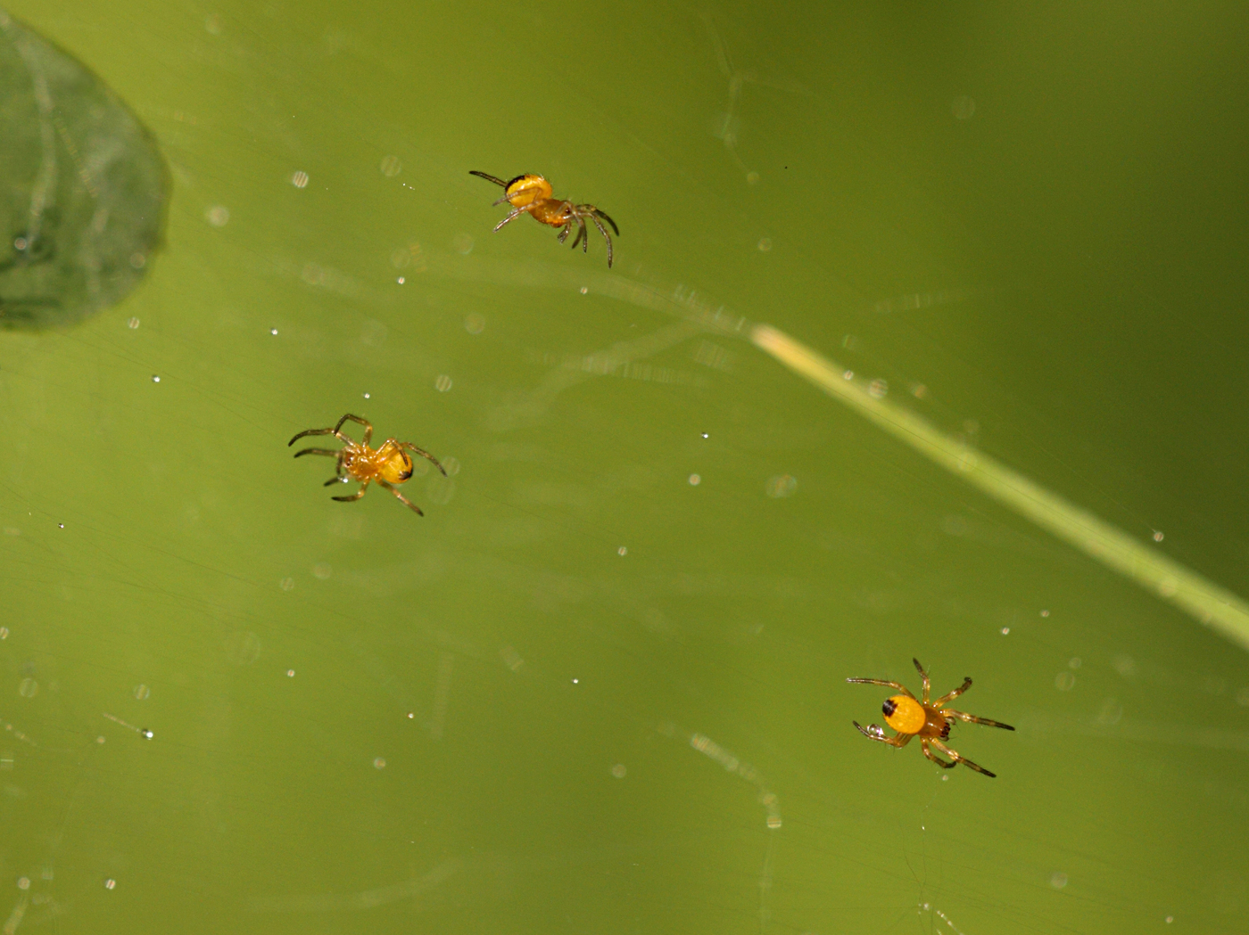Egy kupacban több száz nagyon apró pók nyüzsgésére lettem figyelmes a mezőn. Néhány fűszálat pókháló tartott szorosan együtt, körülötte, egy körülbelül öklömnyi, gömb alakú, hálóból álló fészekben szorongtak a pókok. Amikor néhány elkóborolt egy kicsit távolabb, felfigyeltem a képen látható látványra, és érdekesnek találtam.