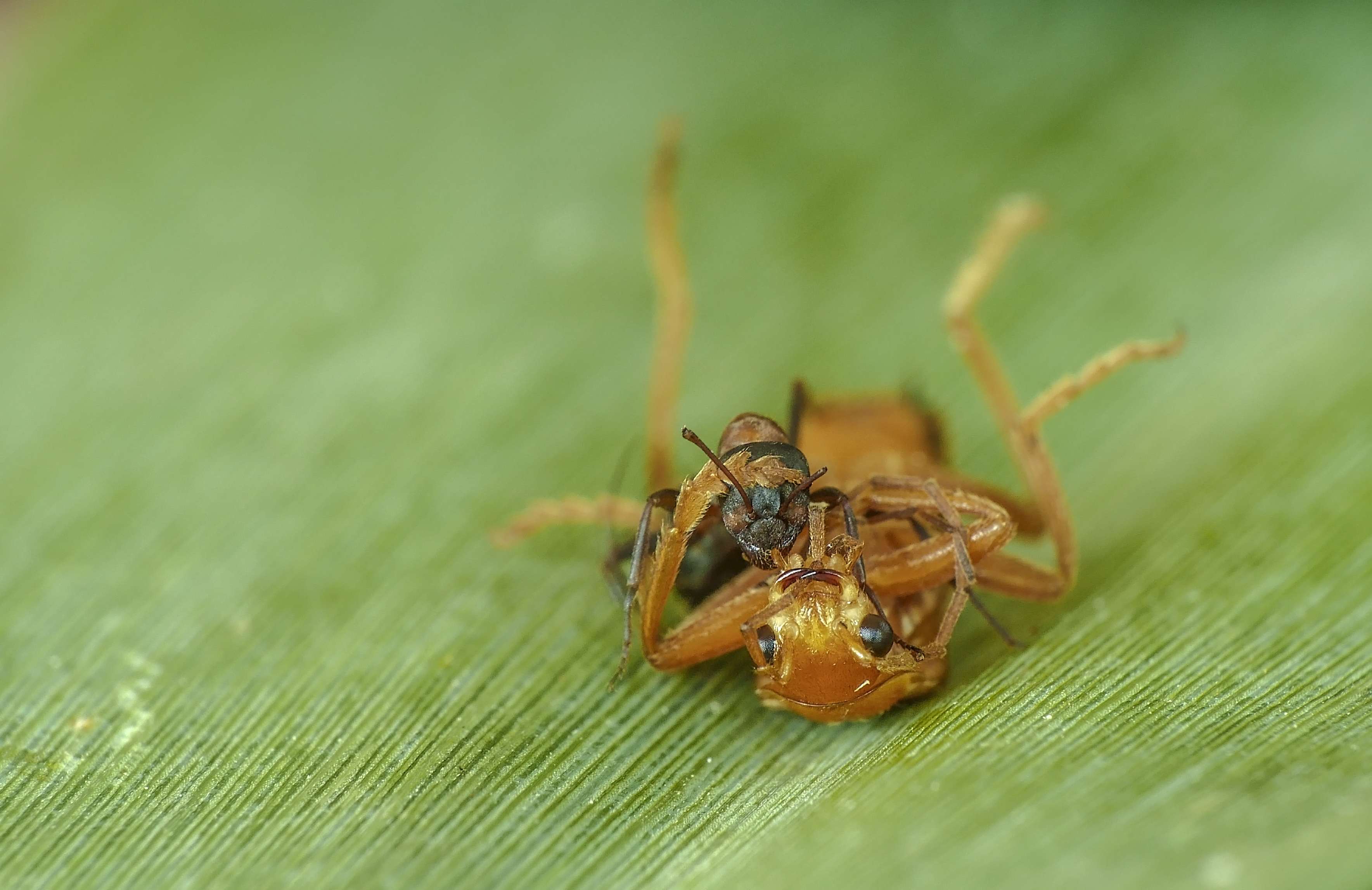 Ezen a képen úgy tűnik mintha tetszene a bogárnak ahogy a hangya éppen a "bajuszkáját" csipkedi. Valójában ádáz csata zajlott köztük. Utólag kicsit sajnálom, hogy a fotózgatás helyett nem videót készítettem.